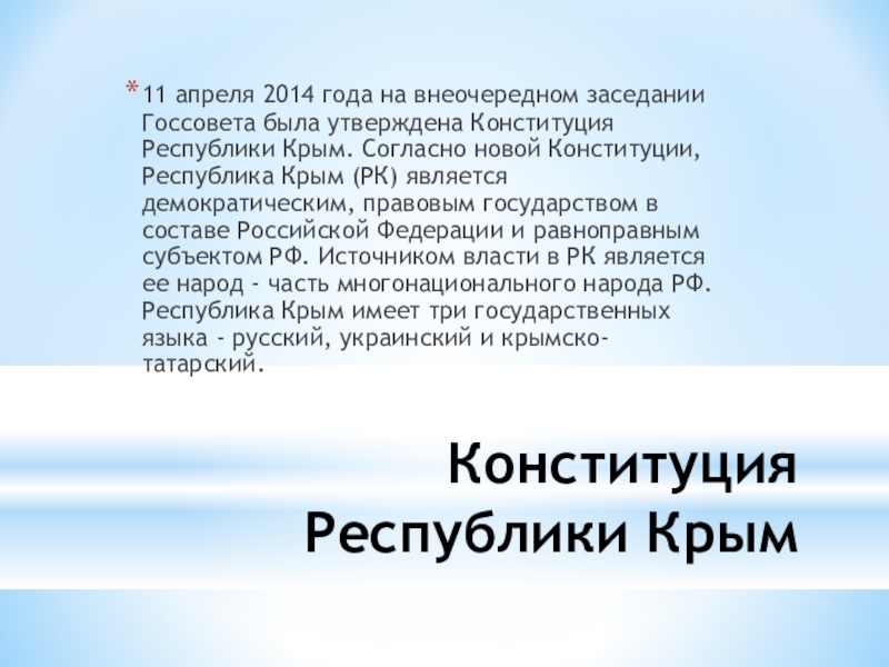 утверждена Конституция Республики Крым. Согласно новой Конституции, Республика Крым (РК) является демократическим, правовым государством в составе Российской Федерации и равноправным субъектом РФ. Источником власти в РК является ее народ - часть многонационального народа РФ. Республика Крым имеет три государственных языка - русский, украинский и крымско-татарский.