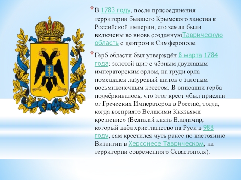 Слайд 10В 1783 году, после присоединения территории бывшего Крымского ханства к Российской империи,
