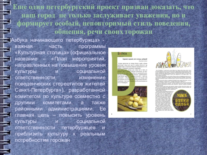 «Азбука начинающего петербуржца» - важная часть программы «Культурная столица» (официальное название – «План мероприятий, направленных на повышение уровня культуры и социальной ответственности, изменение поведенческих стереотипов жителей Санкт-Петербурга»), разработанной комитетом по культуре совместно с другими комитетами, а также районными администрациями. Ее главная цель – повысить уровень культуры и социальной ответственности петербуржцев и приблизить культуру к реальным потребностям горожан.