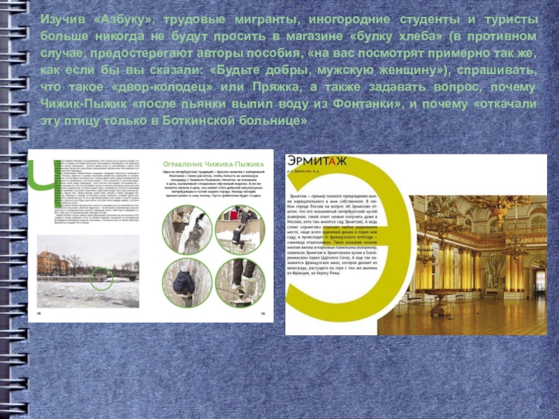 будут просить в магазине «булку хлеба» (в противном случае, предостерегают авторы пособия, «на вас посмотрят примерно так же, как если бы вы сказали: «Будьте добры, мужскую женщину»), спрашивать, что такое «двор-колодец» или Пряжка, а также задавать вопрос, почему Чижик-Пыжик «после пьянки выпил воду из Фонтанки», и почему «откачали эту птицу только в Боткинской больнице»