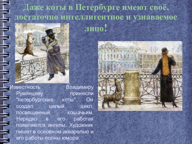 Владимиру Румянцеву принесли "петербургские коты". Он создал целый цикл, посвященный кошачьим. Нередко в его работах появляются ангелы. Художник пишет в основном акварелью и его работы полны юмора.