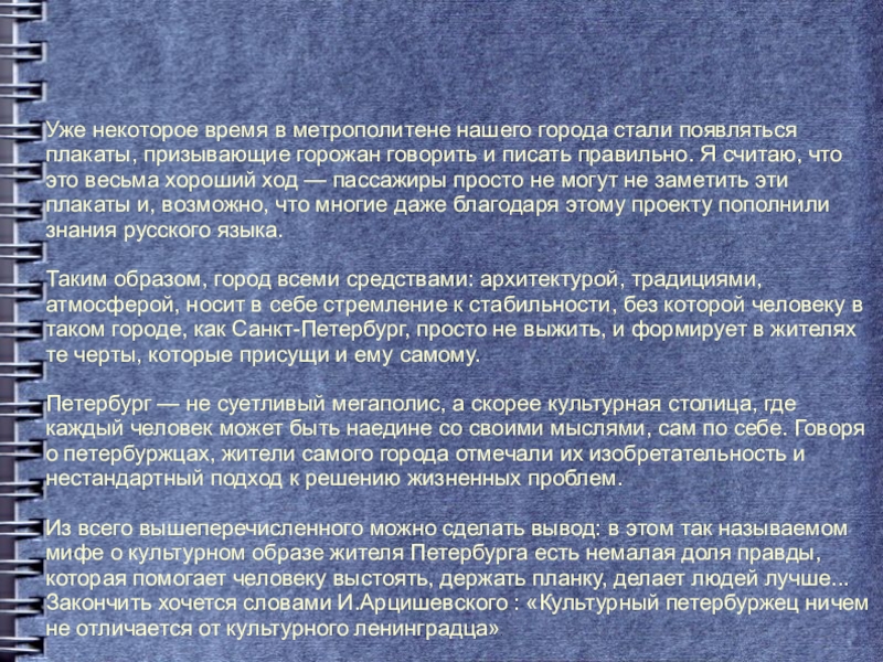 Из всего вышеперечисленного можно сделать вывод: в этом так называемом мифе о культурном образе жителя Петербурга есть немалая доля правды, которая помогает человеку выстоять, держать планку, делает людей лучше...Закончить хочется словами И.Арцишевского : «Культурный петербуржец ничем не отличается от культурного ленинградца».