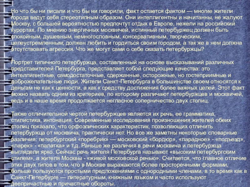 остается фактом — многие жители города ведут себя стереотипным образом. Они интеллигентны и начитанны, не жалуют Москву, с большей вероятностью предпочтут отдых в Европе, нежели на российский курортах. По мнению энергичных москвичей, истинный петербуржец должен быть спокойным, душевным, немногословным, консервативным, творческим, целеустремленным; должен любить и гордиться своим городом, а так же в нем должна отсутствовать агрессия. Что же могут сами о себе сказать петербуржцы?