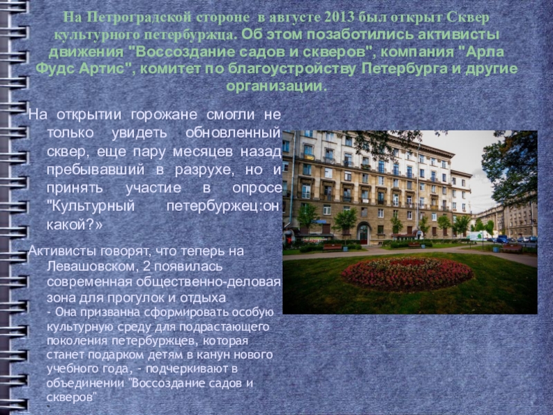 Слайд 12На Петроградской стороне в августе 2013 был открыт Сквер культурного петербуржца.