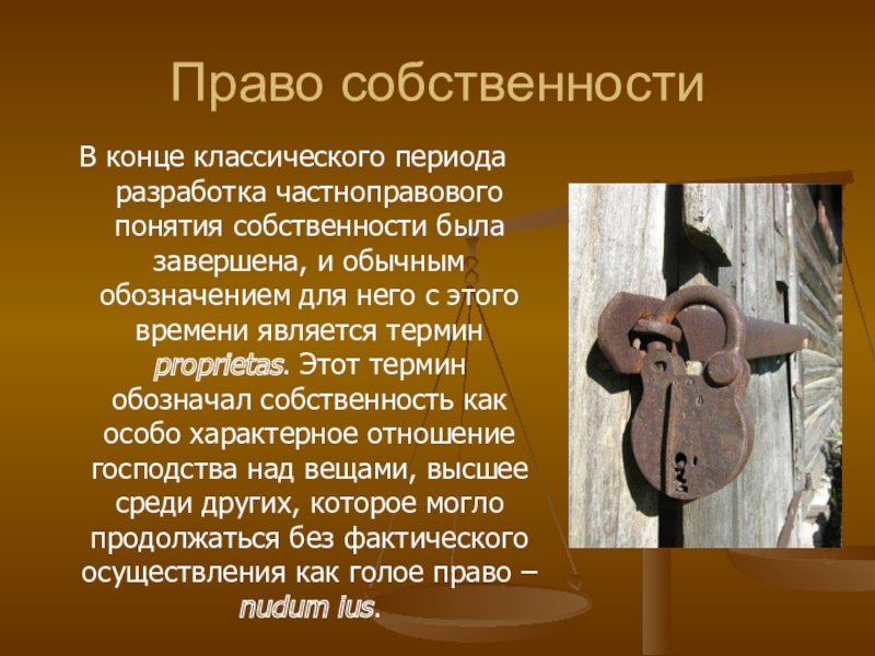 и обычным обозначением для него с этого времени является термин proprietas. Этот термин обозначал собственность как особо характерное отношение господства над вещами, высшее среди других, которое могло продолжаться без фактического осуществления как голое право – nudum ius.