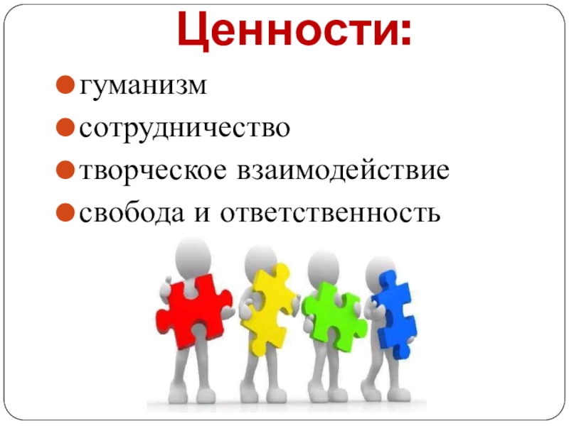 Ценности:гуманизмсотрудничествотворческое взаимодействиесвобода и ответственность