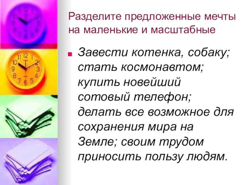 Слайд 6Разделите предложенные мечты на маленькие и масштабные