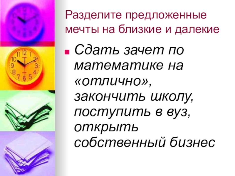 Разделите предложенные мечты на близкие и далекиеСдать зачет по математике на «отлично», закончить школу, поступить в вуз,