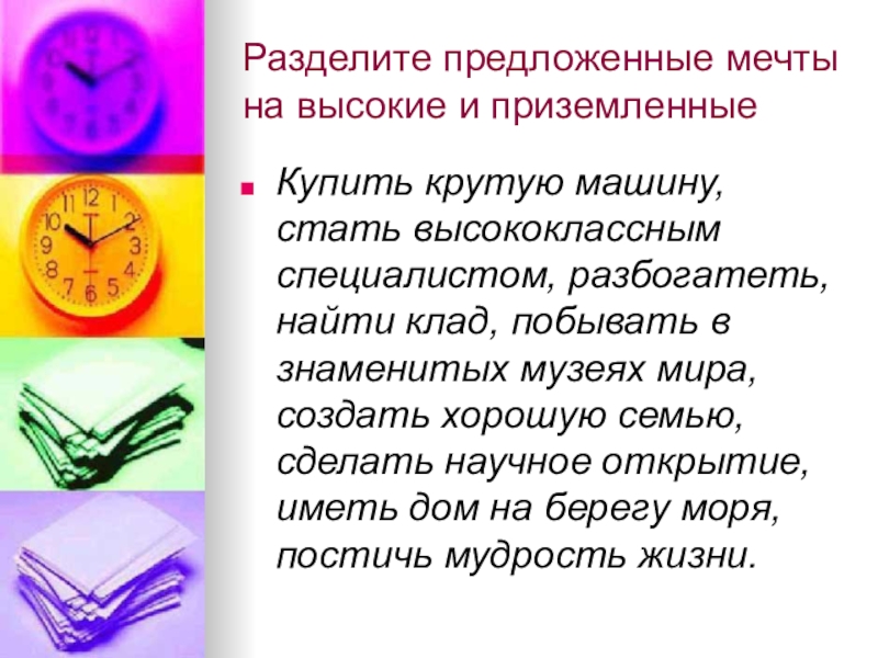 Слайд 4Разделите предложенные мечты на высокие и приземленные