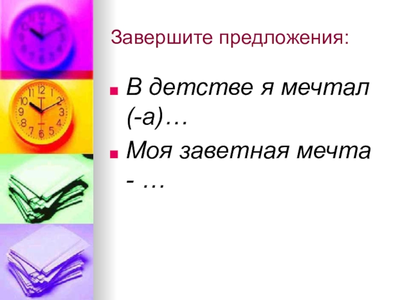 Завершите предложения:В детстве я мечтал(-а)…Моя заветная мечта - …