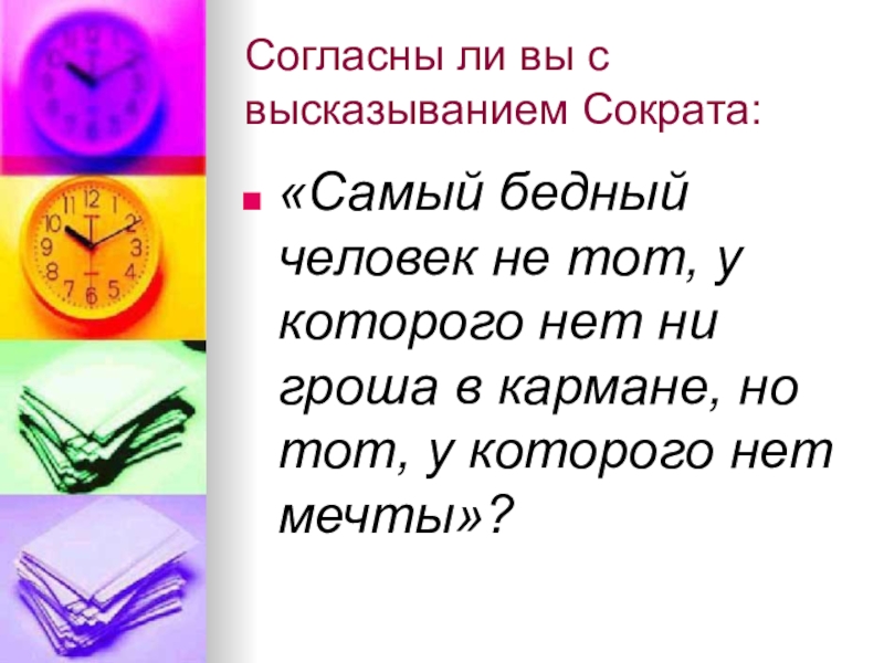 Согласны ли вы с высказыванием Сократа:«Самый бедный человек не тот, у которого нет ни гроша в кармане, но тот, у которого нет мечты»?