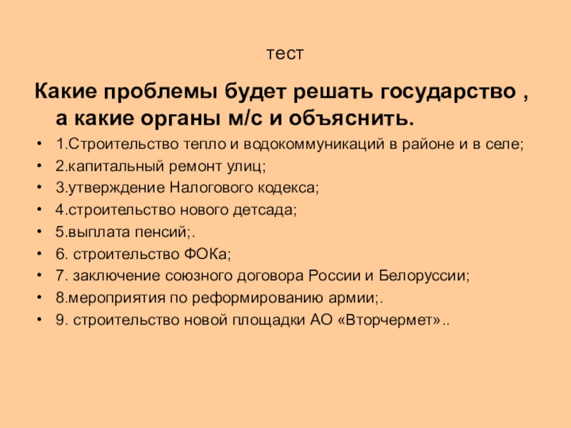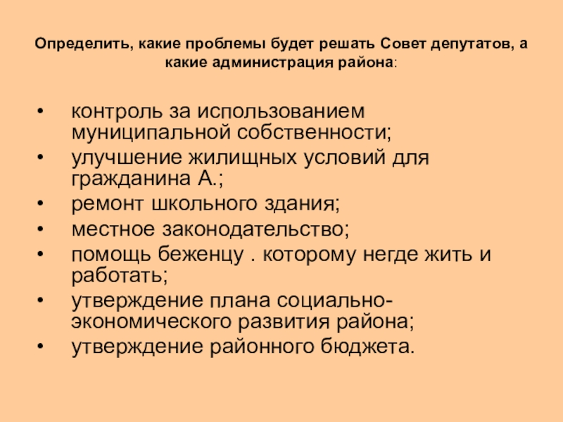 Слайд 16Определить, какие проблемы будет решать Совет депутатов, а какие администрация района: