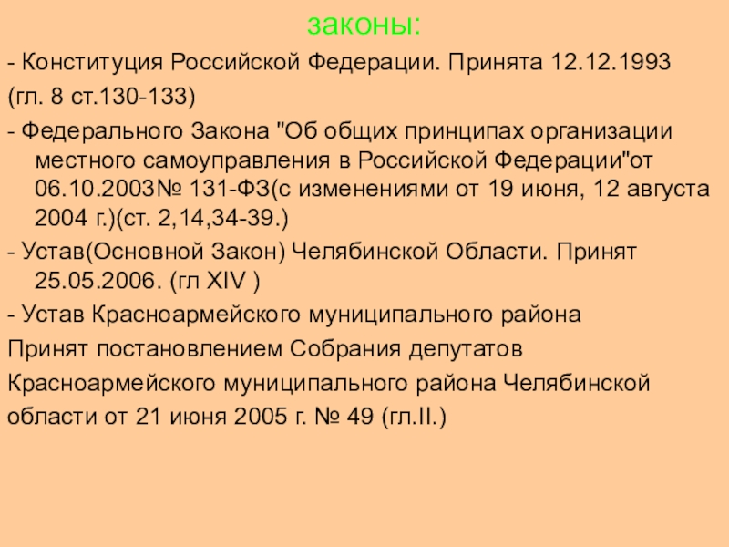 общих принципах организации местного самоуправления в Российской Федерации"от 06.10.2003№ 131-ФЗ(с изменениями от 19 июня, 12 августа 2004 г.)(ст. 2,14,34-39.)