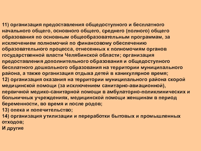 (полного) общего образования по основным общеобразовательным программам, за исключением полномочий по финансовому обеспечению образовательного процесса, отнесенных к полномочиям органов государственной власти Челябинской области; организация предоставления дополнительного образования и общедоступного бесплатного дошкольного образования на территории муниципального района, а также организация отдыха детей в каникулярное время;