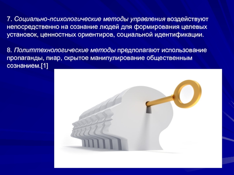 Слайд 107. Социально-психологические методы управления воздействуют непосредственно на сознание людей для формирования