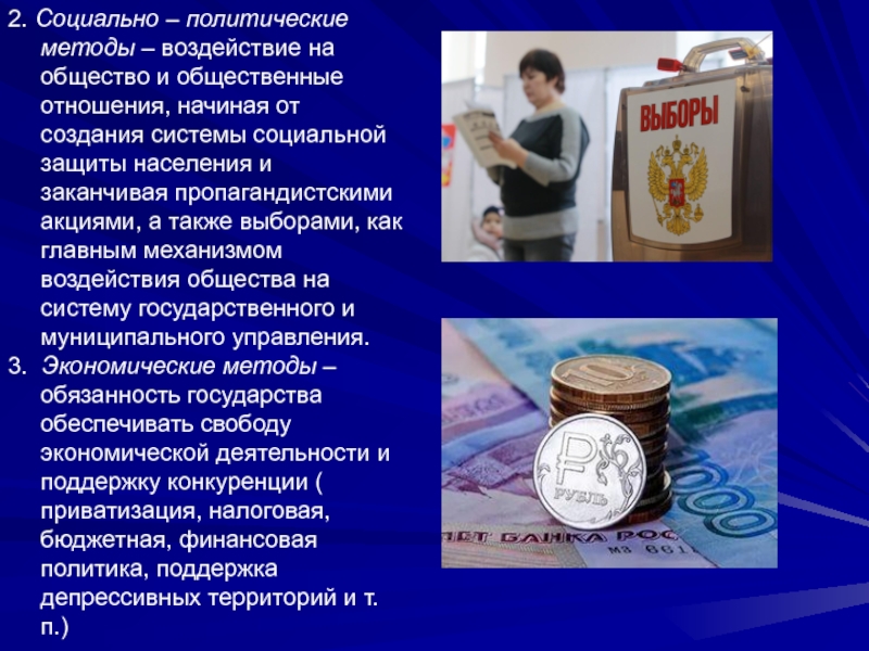 Слайд 82. Социально – политические методы – воздействие на общество и общественные