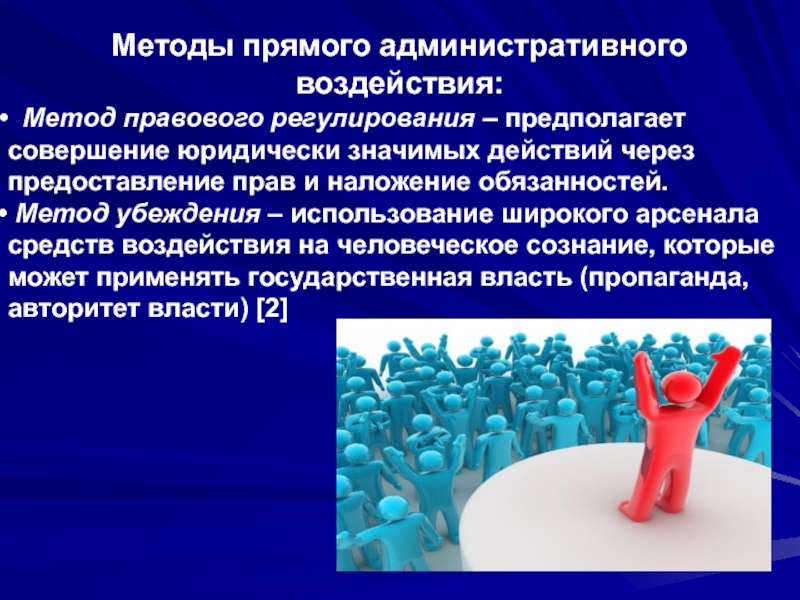 Метод убеждения – использование широкого арсенала средств воздействия на человеческое сознание, которые может применять государственная власть (пропаганда, авторитет власти) [2]