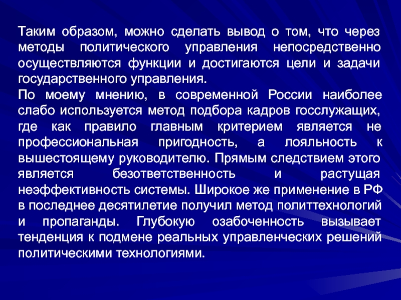 По моему мнению, в современной России наиболее слабо используется метод подбора кадров госслужащих, где как правило главным критерием является не профессиональная пригодность, а лояльность к вышестоящему руководителю. Прямым следствием этого является безответственность и растущая неэффективность системы. Широкое же применение в РФ в последнее десятилетие получил метод политтехнологий и пропаганды. Глубокую озабоченность вызывает тенденция к подмене реальных управленческих решений политическими технологиями.