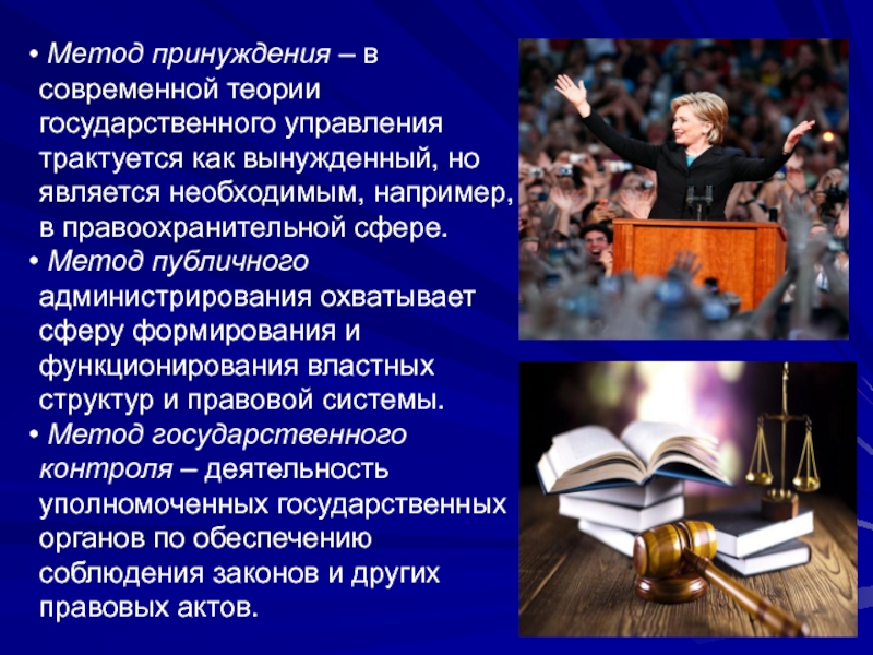 Слайд 6 Метод принуждения – в современной теории государственного управления трактуется как
