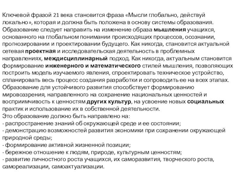 и должна быть положена в основу системы образования. Образование следует направить на изменение образа мышления учащихся, основанного на глобальном понимании происходящих процессов, осознании, прогнозировании и проектировании будущего. Как никогда, становится актуальной сетевая проектная и исследовательская деятельность в проблемных направлениях, междисциплинарный подход. Как никогда, актуальным становится формирование инженерного и математического стилей мышления, позволяющих построить модель изучаемого явления, спроектировать техническое устройство, спланировать весь процесс создания разработки и сопроводить ее на всех этапах. Образование для устойчивого развития способствует формированию мировоззрения, направленного на сохранение национальных ценностей и восприимчивость к ценностям других культур, на усвоение новых социальных практик и использование их в собственной деятельности. Это образование должно быть направлено на: - распространение знаний об окружающей среде и ее состоянии; - демонстрацию возможностей развития экономики при сохранении окружающей природной среды; - формирование активной жизненной позиции; - бережное отношение к людям, природе, культурным ценностям; - развитие личностного роста учащихся, их саморазвития, творческого роста, самореализации, самоактуализации.