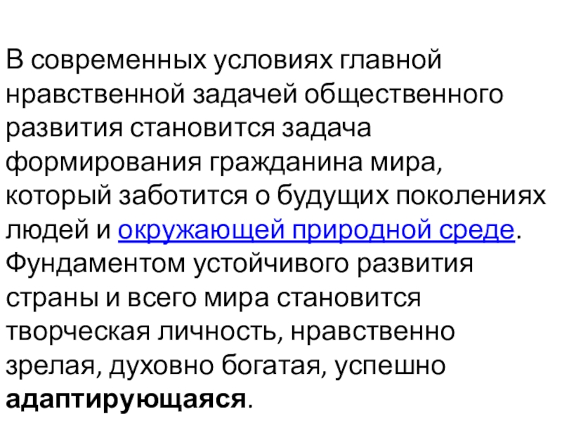 В современных условиях главной нравственной задачей общественного развития становится задача формирования гражданина мира, который заботится о будущих