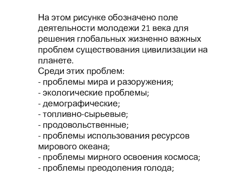 На этом рисунке обозначено поле деятельности молодежи 21 века для решения глобальных жизненно важных проблем существования цивилизации