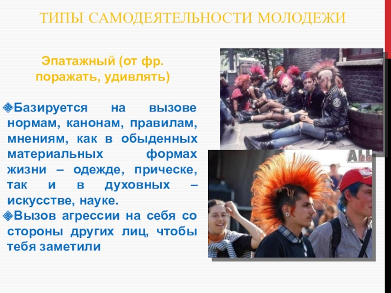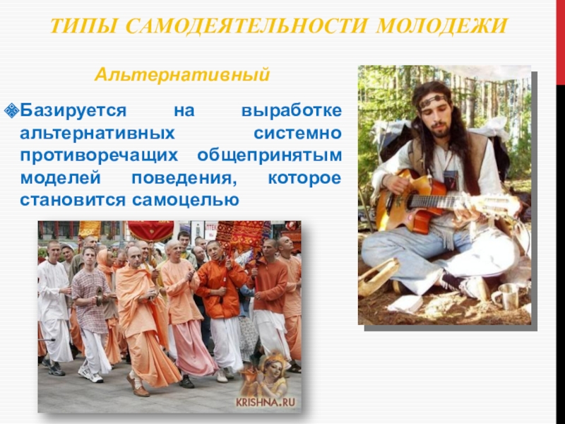 - Гедонистическо-развлекательные (мажоры, рэйверы, рэпперы и т.п.),