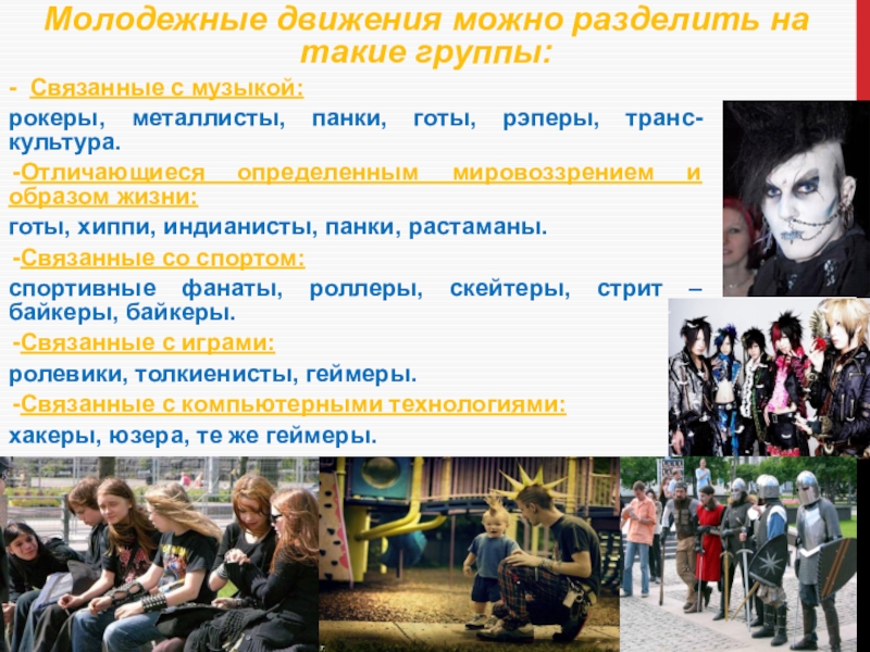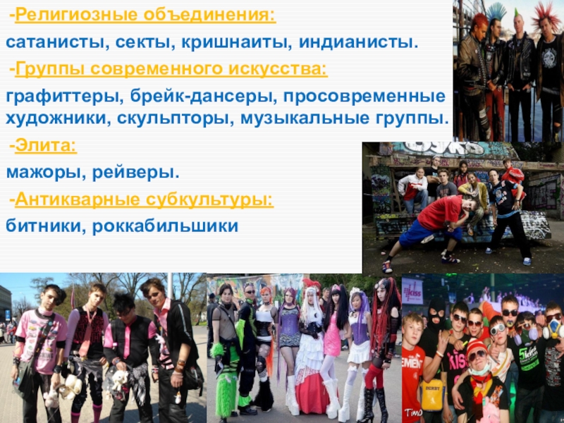 рокеры, металлисты, панки, готы, рэперы, транс-культура.