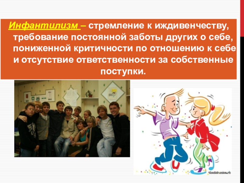 Слайд 10Инфантилизм – стремление к иждивенчеству, требование постоянной заботы других о себе,