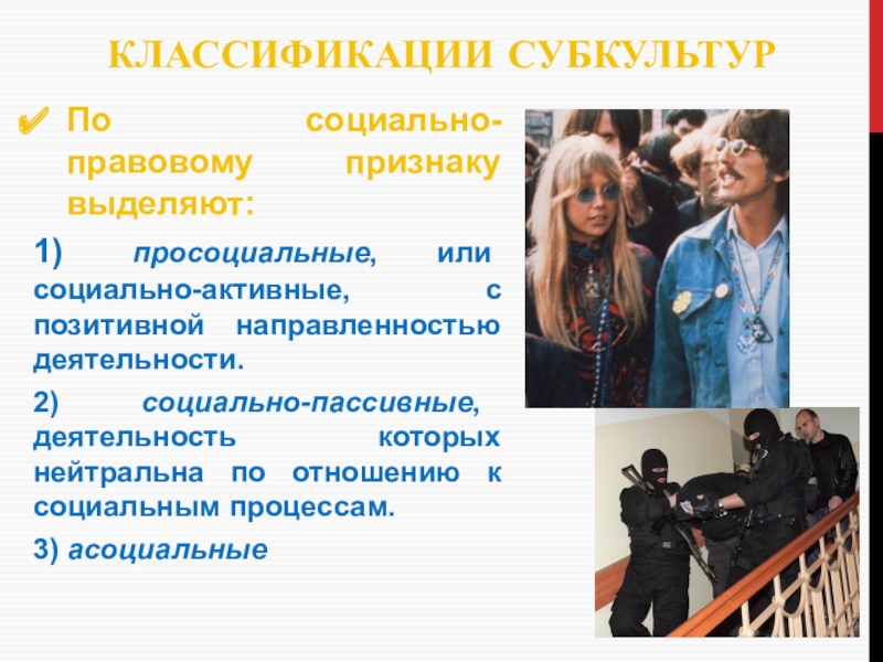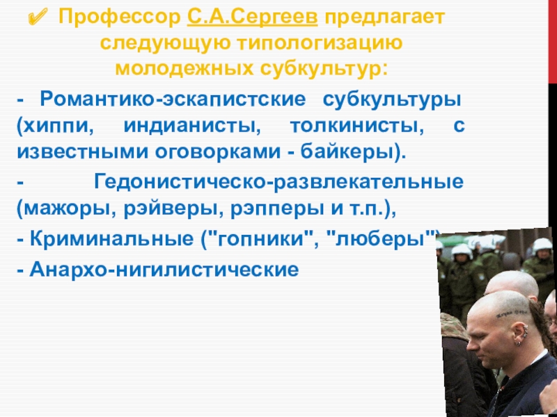 Слайд 19Профессор С.А.Сергеев предлагает следующую типологизацию молодежных субкультур: