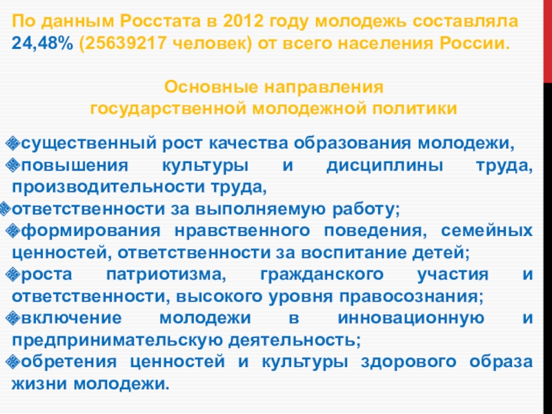 Слайд 24По данным Росстата в 2012 году молодежь составляла 24,48% (25639217 человек)