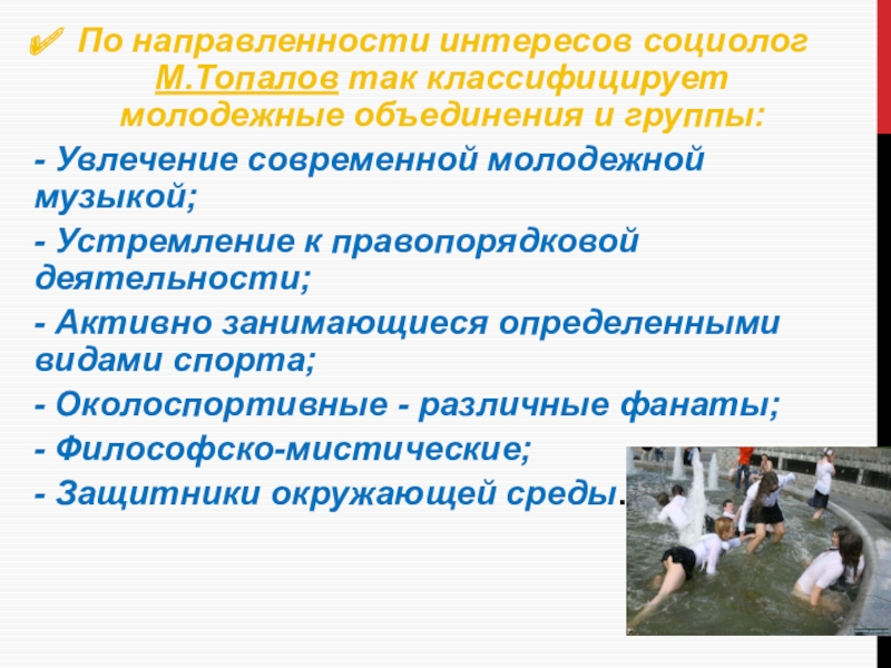 Слайд 18По направленности интересов социолог М.Топалов так классифицирует молодежные объединения и группы: