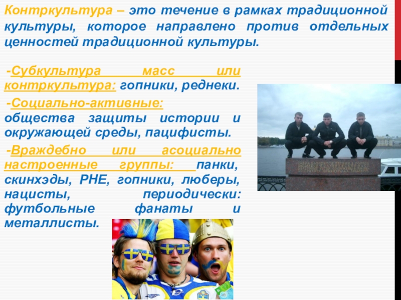 Слайд 22Субкультура масс или контркультура: гопники, реднеки.