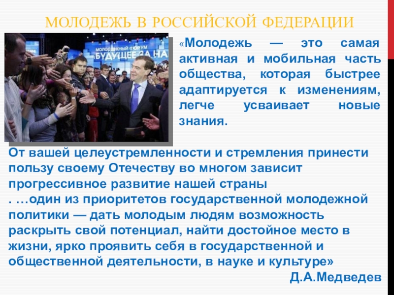 . …один из приоритетов государственной молодежной политики — дать молодым людям возможность раскрыть свой потенциал, найти достойное место в жизни, ярко проявить себя в государственной и общественной деятельности, в науке и культуре»