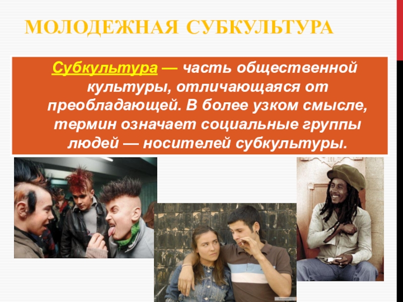 3) усложнение общественной жизни, рост мобильности, изменение социальной жизни привели к возникновению молодежной субкультуры.