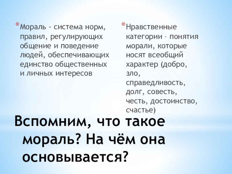 Нравственные категории – понятия морали, которые носят всеобщий характер (добро, зло, справедливость, долг, совесть, честь, достоинство, счастье)