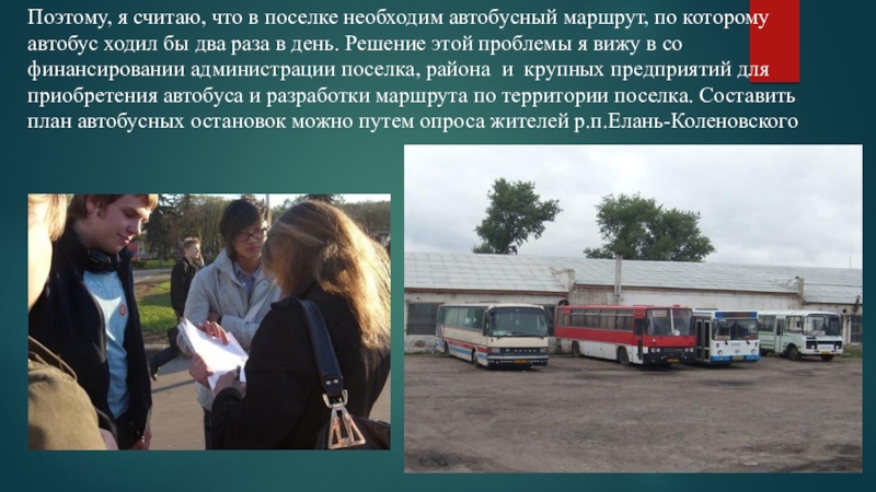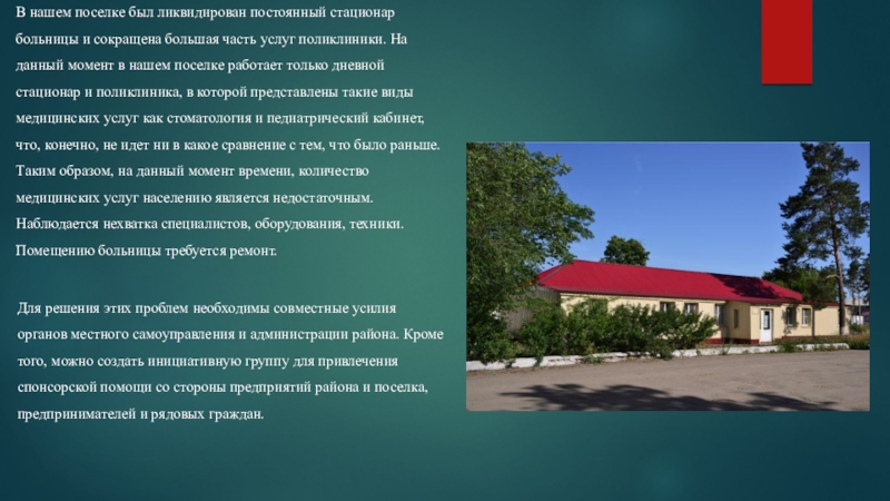 Для решения этих проблем необходимы совместные усилия органов местного самоуправления и администрации района. Кроме того, можно создать инициативную группу для привлечения спонсорской помощи со стороны предприятий района и поселка, предпринимателей и рядовых граждан.