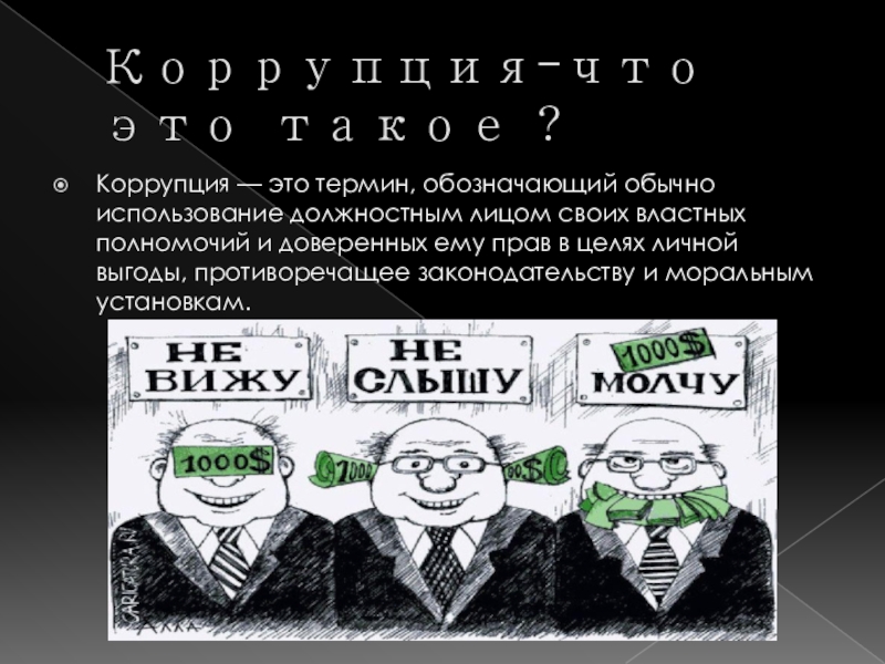 бюрократия: взятки за оформление справок, разрешений, прочих документов; (основная статья) борьба с коррупцией: фактически является прикрытием для распилки средств, выделенных на ее реализацию;