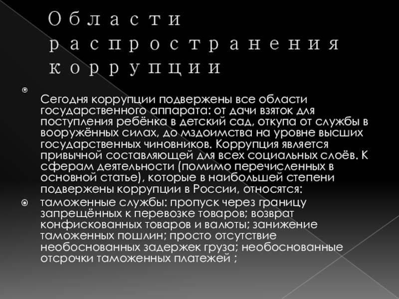 взяток для поступления ребёнка в детский сад, откупа от службы в вооружённых силах, до мздоимства на уровне высших государственных чиновников. Коррупция является привычной составляющей для всех социальных слоёв. К сферам деятельности (помимо перечисленных в основной статье), которые в наибольшей степени подвержены коррупции в России, относятся: