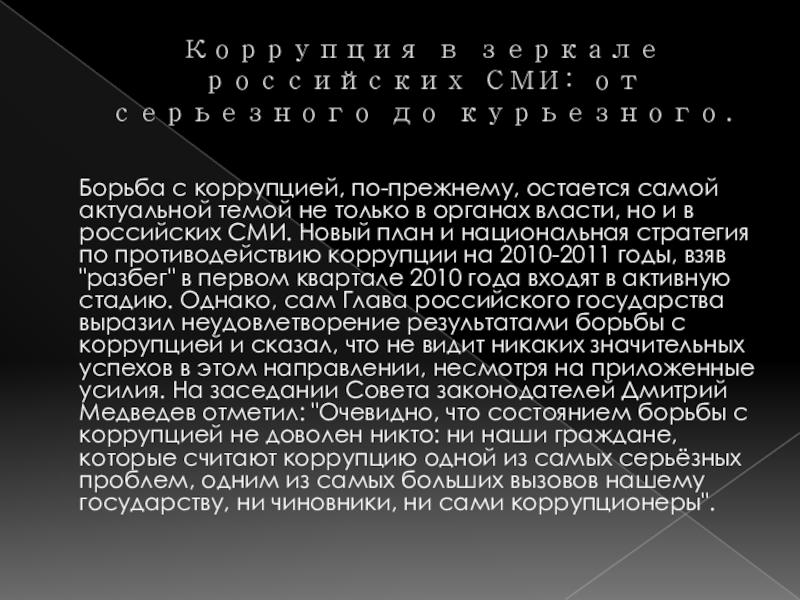 по-прежнему, остается самой актуальной темой не только в органах власти, но и в российских СМИ. Новый план и национальная стратегия по противодействию коррупции на 2010-2011 годы, взяв "разбег" в первом квартале 2010 года входят в активную стадию. Однако, сам Глава российского государства выразил неудовлетворение результатами борьбы с коррупцией и сказал, что не видит никаких значительных успехов в этом направлении, несмотря на приложенные усилия. На заседании Совета законодателей Дмитрий Медведев отметил: "Очевидно, что состоянием борьбы с коррупцией не доволен никто: ни наши граждане, которые считают коррупцию одной из самых серьёзных проблем, одним из самых больших вызовов нашему государству, ни чиновники, ни сами коррупционеры".