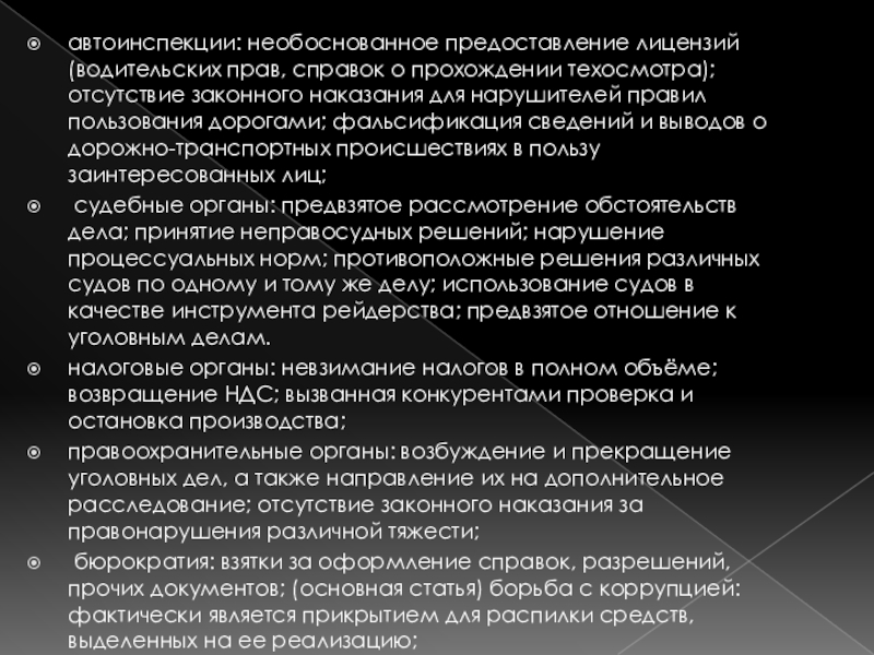 Слайд 9автоинспекции: необоснованное предоставление лицензий (водительских прав, справок о прохождении техосмотра); отсутствие