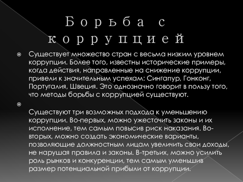 Существуют три возможных подхода к уменьшению коррупции. Во-первых, можно ужесточить законы и их исполнение, тем самым повысив риск наказания. Во-вторых, можно создать экономические варианты, позволяющие должностным лицам увеличить свои доходы, не нарушая правила и законы. В-третьих, можно усилить роль рынков и конкуренции, тем самым уменьшив размер потенциальной прибыли от коррупции.