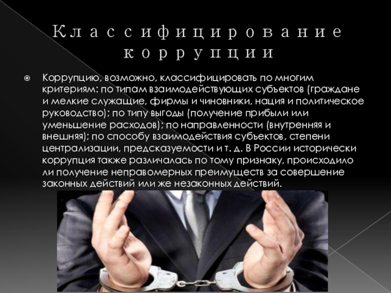 (граждане и мелкие служащие, фирмы и чиновники, нация и политическое руководство); по типу выгоды (получение прибыли или уменьшение расходов); по направленности (внутренняя и внешняя); по способу взаимодействия субъектов, степени централизации, предсказуемости и т. д. В России исторически коррупция также различалась по тому признаку, происходило ли получение неправомерных преимуществ за совершение законных действий или же незаконных действий.