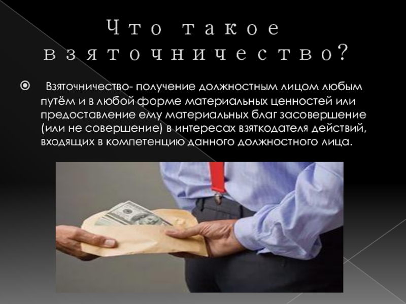 любой форме материальных ценностей или предоставление ему материальных благ засовершение (или не совершение) в интересах взяткодателя действий, входящих в компетенцию данного должностного лица.