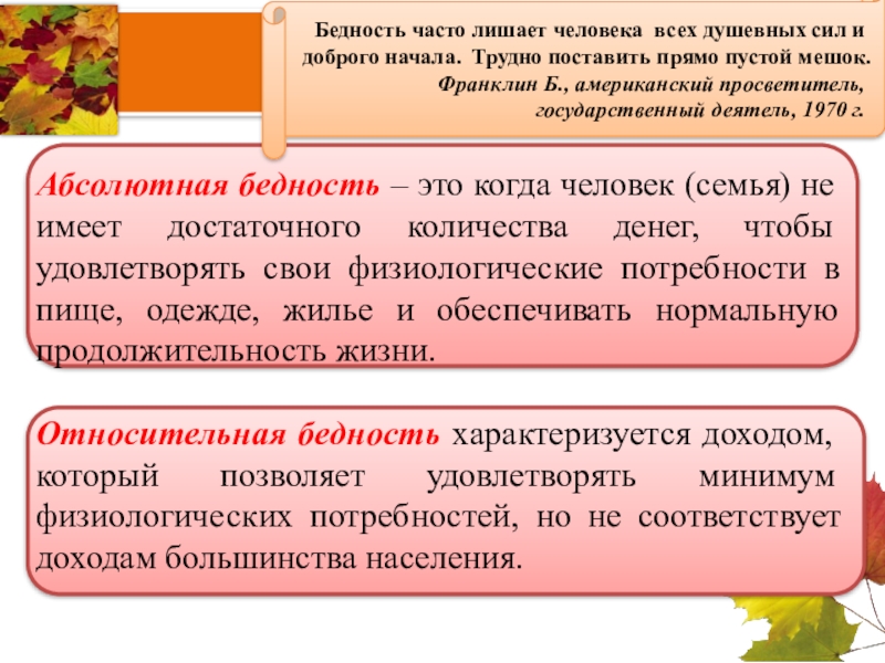 Абсолютная бедность – это когда человек (семья) не имеет достаточного количества денег, чтобы удовлетворять свои физиологические потребности в пище, одежде, жилье и обеспечивать нормальную продолжительность жизни.
