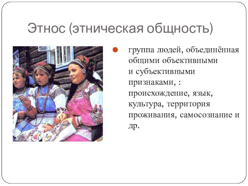 группа людей, отличающаяся общностью ряда признаков — языка, культуры, территории, религии, исторического прошлого и т. д.