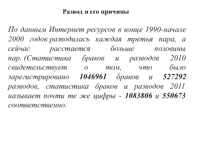 Развод и его причиныПо данным Интернет ресурсов в конце 1990-начале 2000 годов разводилась каждая третья пара, а сейчас