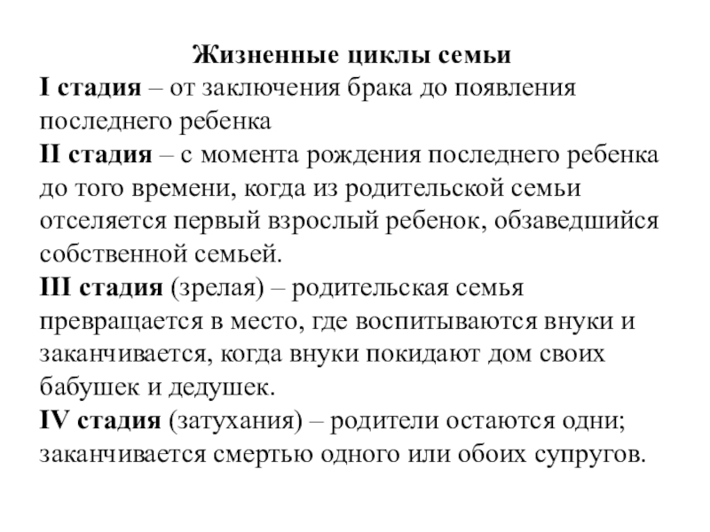 IV стадия (затухания) – родители остаются одни; заканчивается смертью одного или обоих супругов.