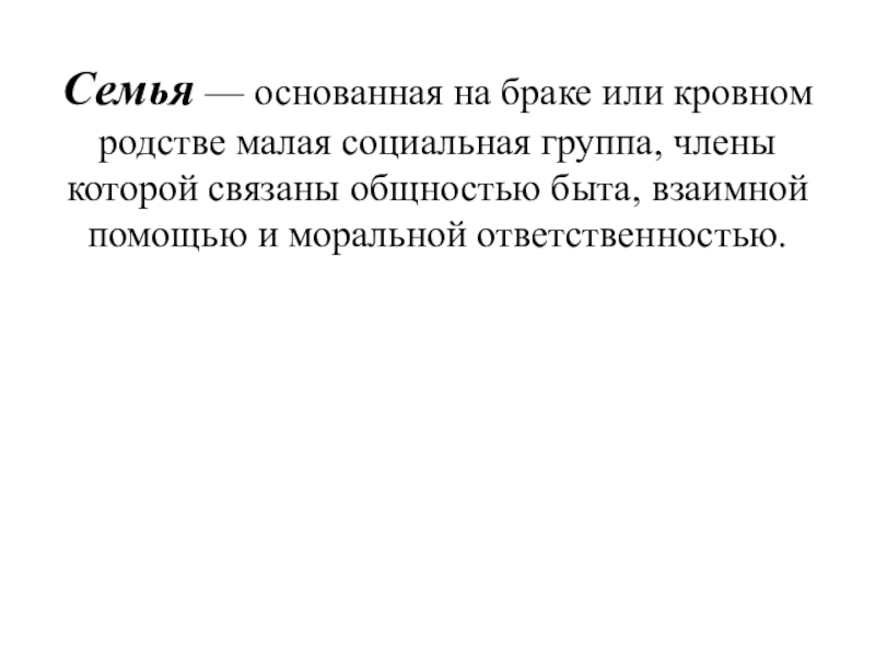 Семья — основанная на браке или кровном родстве малая социальная группа, члены которой связаны общностью быта, взаимной помощью