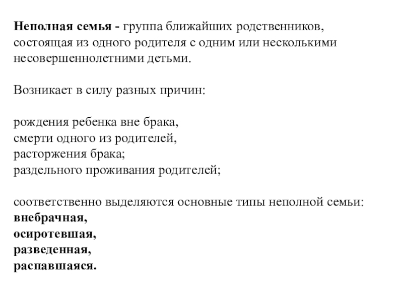 Неполная семья - группа ближайших родственников, состоящая из одного родителя с одним или несколькими несовершеннолетними детьми. Возникает